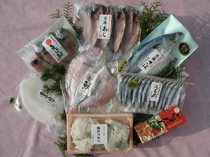 | あじ開き(3枚~4枚)(九州産)、さば開き(1枚)(長崎産)、えぼ鯛開き(3枚)(九州産)、もいか一夜干し(1枚)(豊後水道産or宮崎産)、鯛開き(1枚)(大分産or宮崎産)、うるめ袋(1袋)(国内産)、鮪かつれつ(1パック)(宮崎産)、ごまだし(200g)(大分産) |