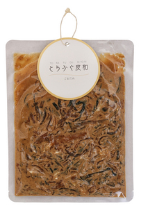 ぷりっぷりの食感で、コラーゲンが豊富なとらふぐの皮をたっぷり使った、とらふぐの皮和えです。皮と相性の良い「ごまだれ」で味付けしています。解凍して他の食材と和えるだけ。すぐにとらふぐを使ったメニューの出来上がりです。